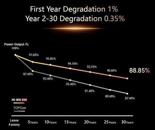 L’un des points forts du Hi-MO X10 réside dans sa fiabilité à long terme. LONGi garantit une dégradation de seulement 1 % la première année, avec un taux annuel limité à 0,35 %.