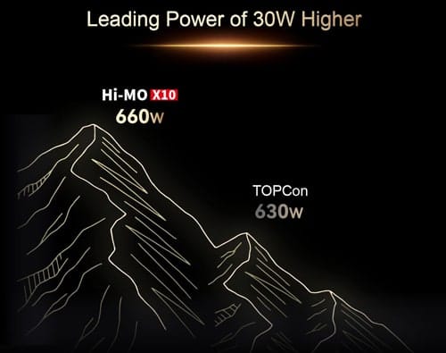 - Rendement élevé : TOPCon offre des performances solides, généralement autour de 23-24 %, mais légèrement inférieures aux modules Hi-MO avec HPBC.